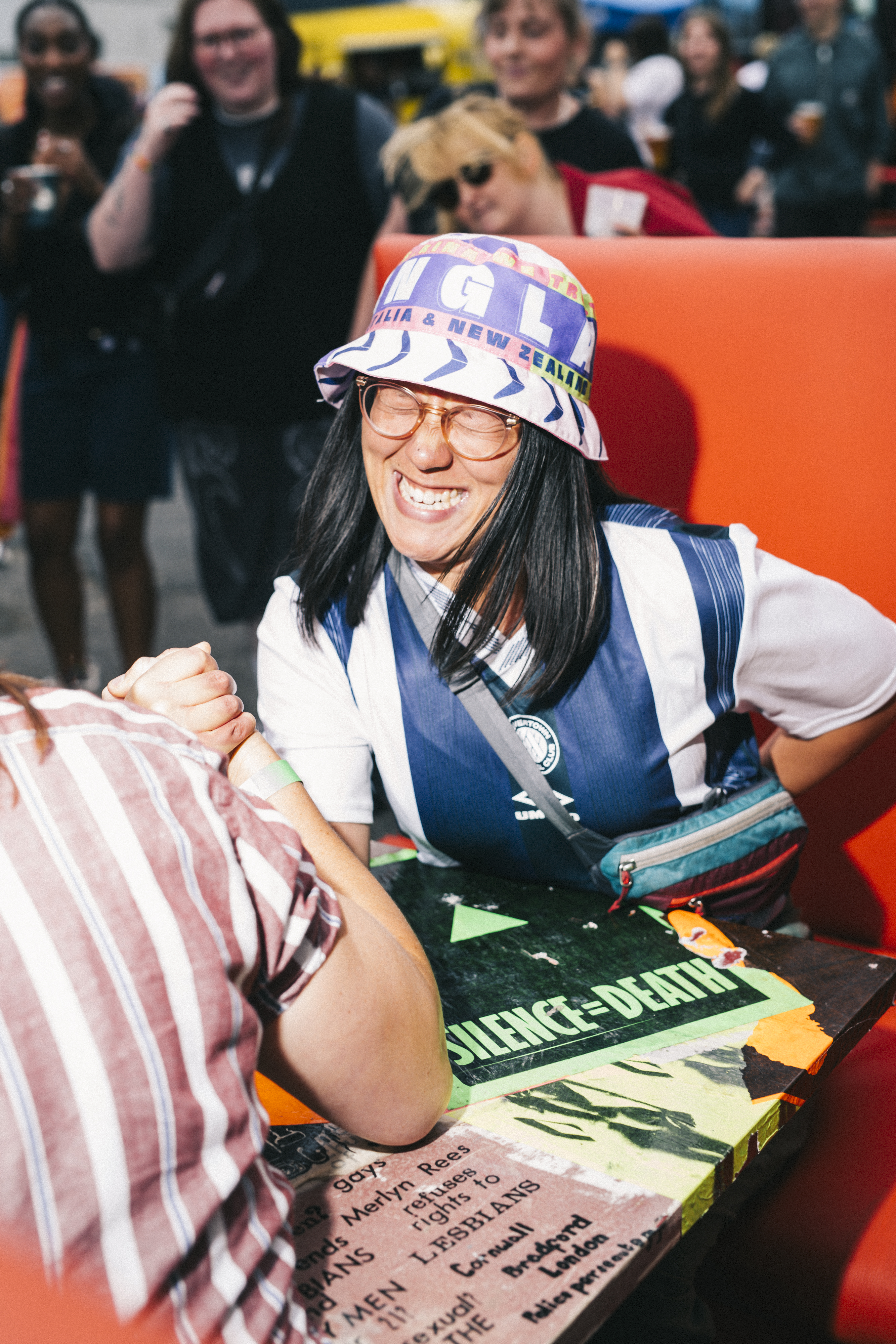 Designed and built by Lucy Nurnberg and an all-FLINTA crew, the Mobile Dyke Bar is housed inside the shell of rented curtainside vans. Depending on its host location, it can function as a bar, a hangout destination, an entertainment space and a stage — but has become most famous for its legendary arm wrestling tournaments, with megaphone commentary by a dream team of Uhaul Dyke Rescue MCs.