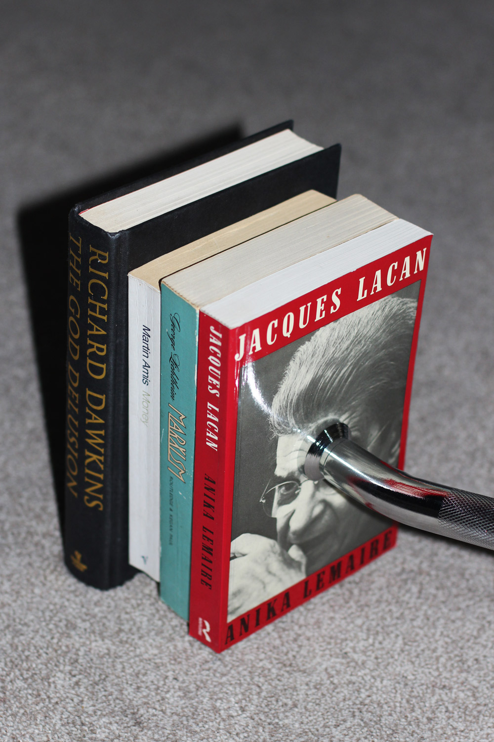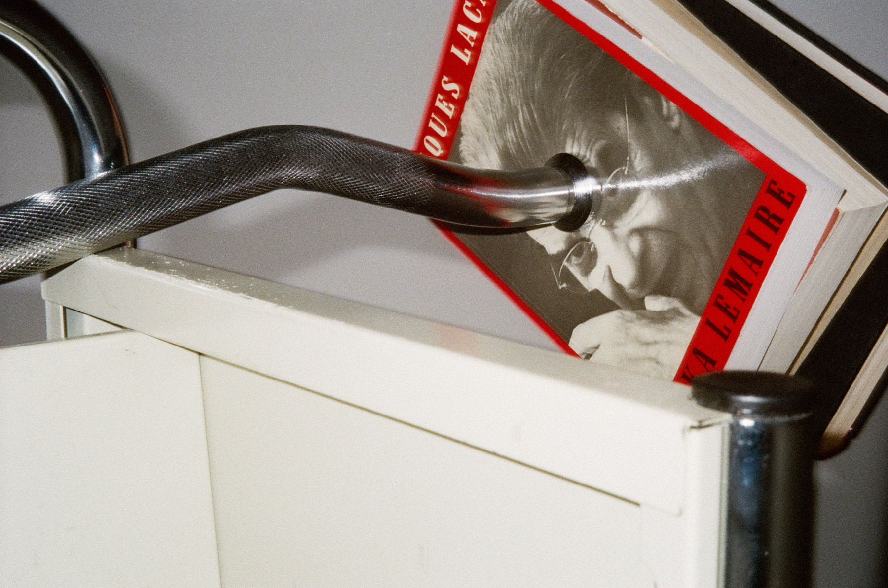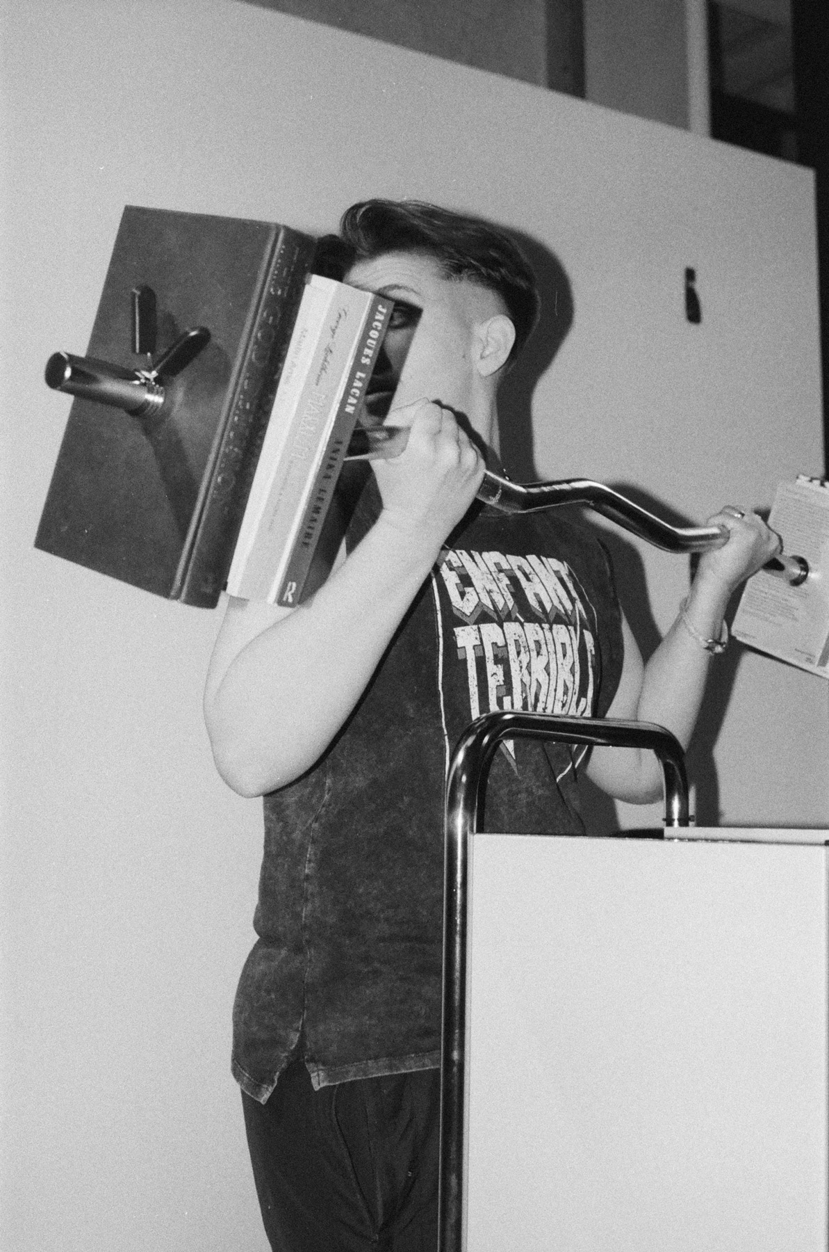 The set included a custom-made book barbell and chain-suspended mirror, with queer literature and furniture sourced from Goldmsith’s library next door. This performance was initially commissioned by Jessa Mockridge and the Feminist Duration Reading Group and was showcased as part of an afternoon of screenings called ‘bodying libraries’ at Goldsmiths CCA on January 7 2024.