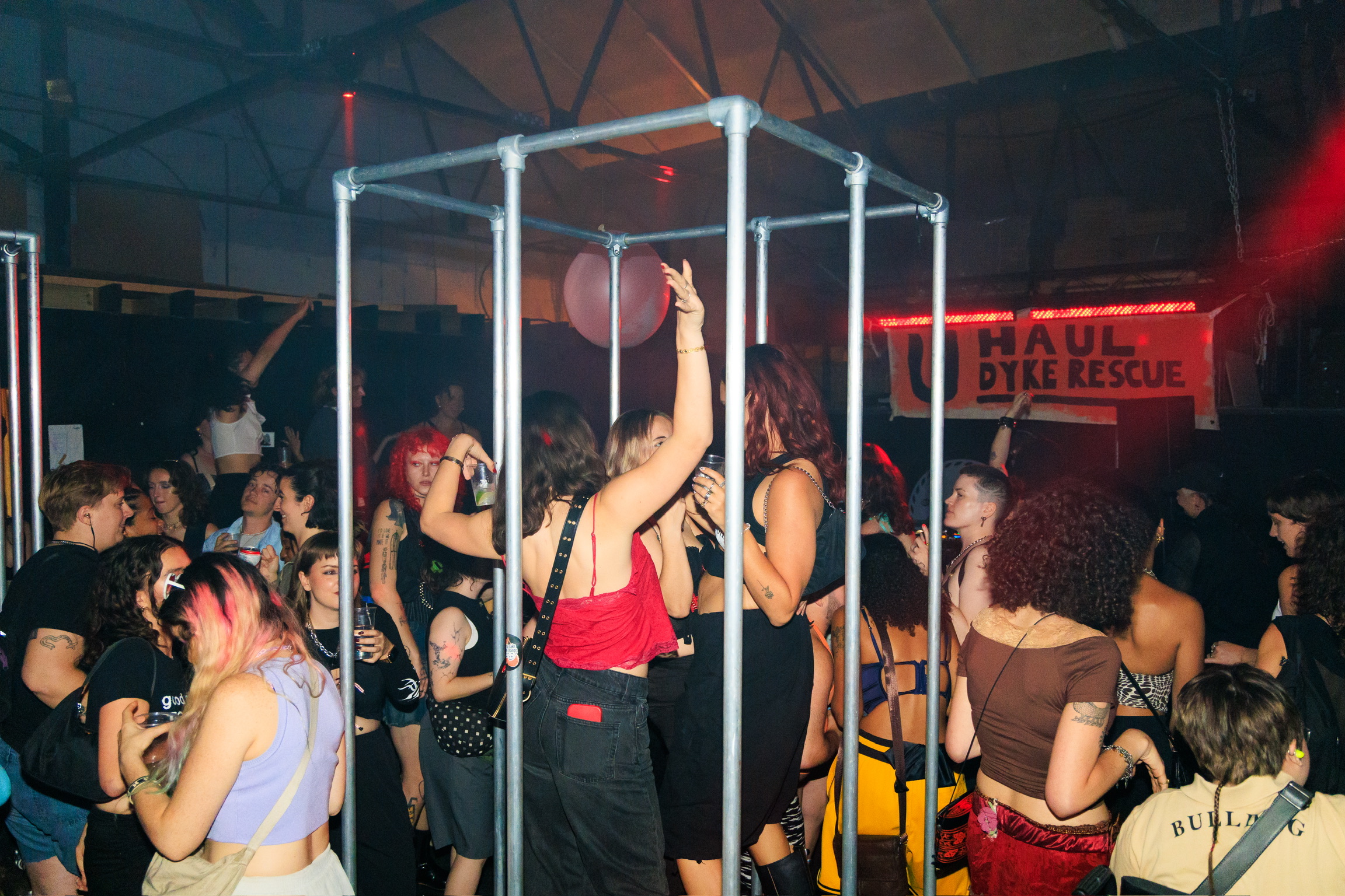 Two custom designed and fabricated gogo cages for the dancefloor, used at Uhaul Dyke Raves, Plastyk, FAE the Rave and Mighty Hoopla. Made in London by Lucy Nurnberg and Ali Wagner